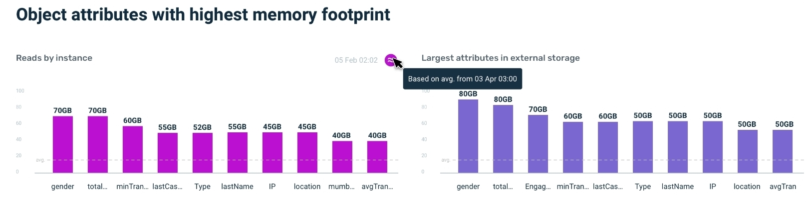 Based on the properties of each Object Type, and the number of occurrences of each property, On Demand Object Analysis calculates the amount of memory stored within a Space Object. In addition, it calculates the memory footprint of the object indexes.