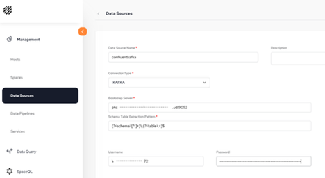 4. In SpaceDeck, under Data Source, create a new data source of type KAFKA.