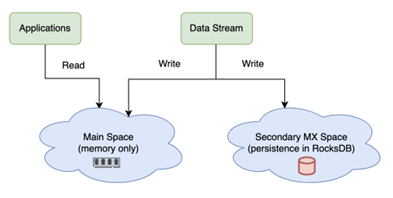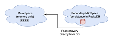In some use cases, the in-memory space can’t use memoryXtened as extreme write/update/take performance is required, and a direct persistence approach can’t be used. In these cases, it is recommended to use two spaces - one as the main in-memory space and a secondary space for persistence.
