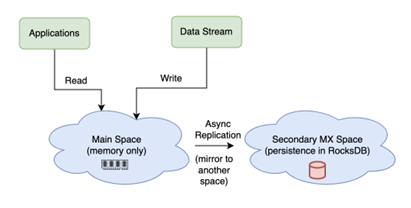 Replicating all changes from the main space to the secondary space in an async manner, as shown in the diagram below: