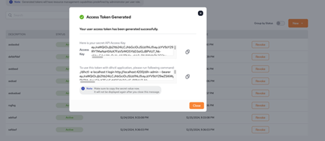 After the new token is created, a dialog box appears showing the secret API access key.