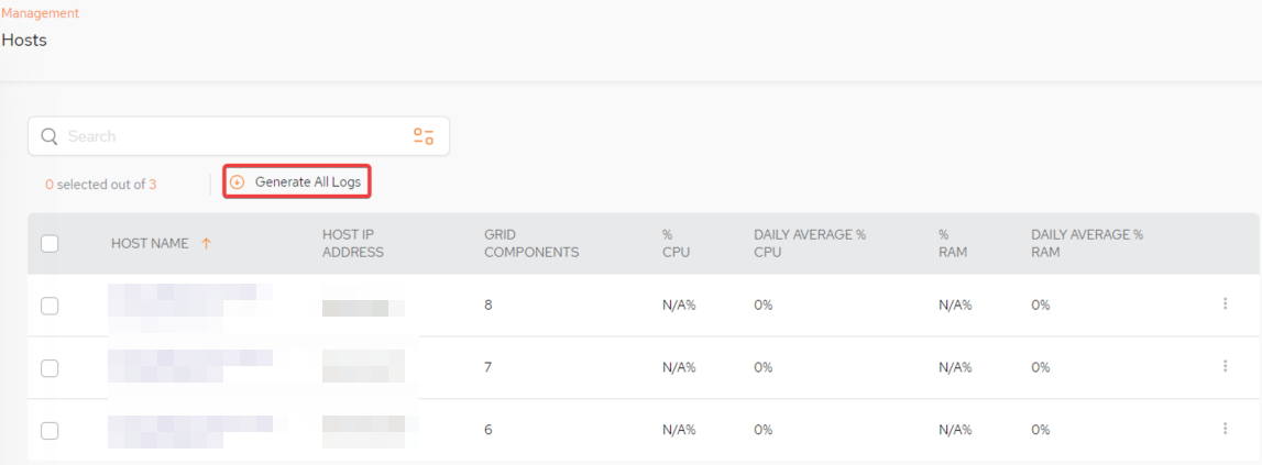 Log dump of all hosts: Clicking the Generate All Logs option situated above the table
